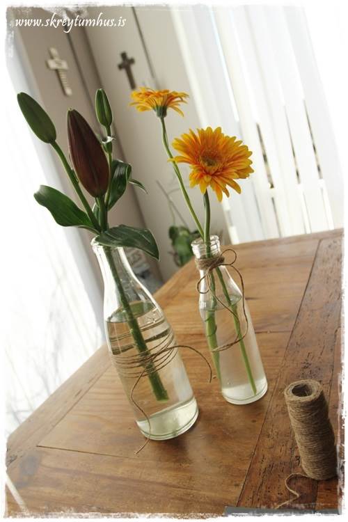 …ég tók gerberurnar og setti í gamlar flöskur, ásamt einni eldlilju…
