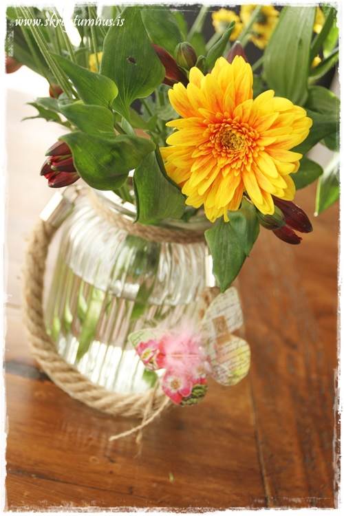 …restina af blómunum stytti ég vel og setti í krukkuna sætu, sem ég sýndi í Rúmfatalagers-innlitinu í morgun.  Þetta er kertakrukka, en mér finnst hún æði með blómum í.  Þið ættuð líka að vera óhræddar við að stytta svona búntablóm, því að oft eru þau bara mikið fallegri í lægri vöndum…
