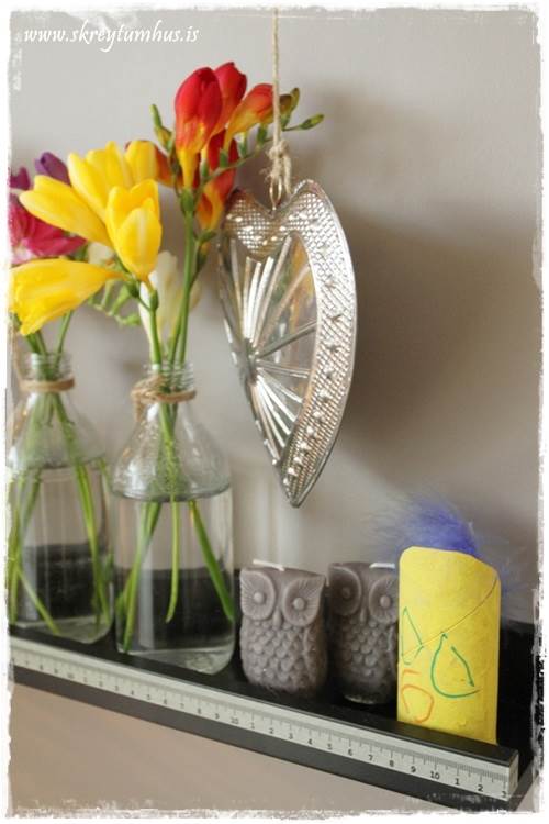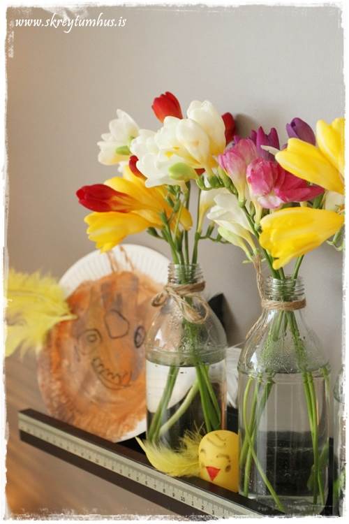 …og annars staðar fær skrautið frá krökkunum að njóta sín, ásamt fresíum í litlum vösum…