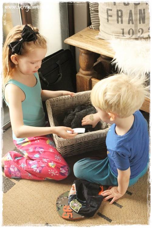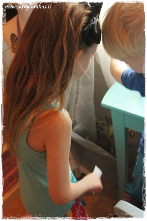 …ég ætlaði að teikna vísbendingar fyrir litla manninn, en þau vildu fá að leita saman.  Vera saman í þessu, það er þeirra – eins og sést á því hvernig þau hjálpast að………og já, þarna er jólabjór í hillunni, við verðum að fara að drekka meira 😉