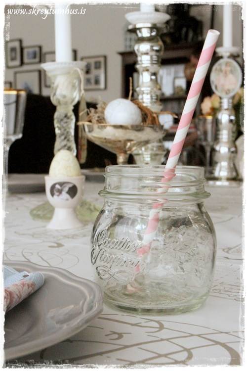 Yndislega kósý….væri svo til í að eignast svona dúk, ekkert smá fallegur. Diskarnir æði og vintage eggin og krukkurnar eitt það krúttlegasta sem til er!