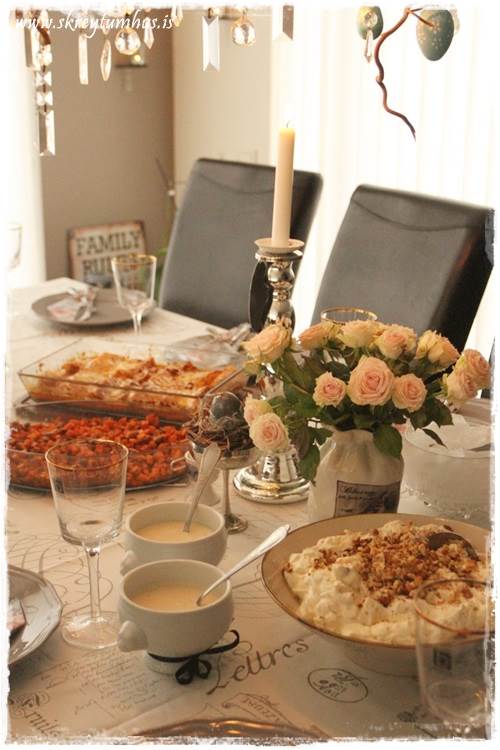 …góðar svona mini-skreytingar, þær ganga vel með á svona matarborði – þrátt fyrir að maturinn sé kominn á borðið…