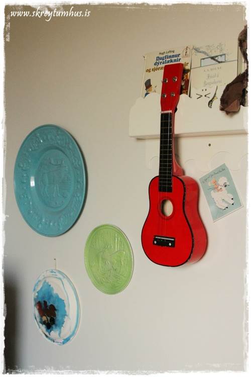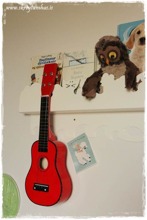 …gítarinum er bara tillt þarna á hilluna, og litli gaur sækir hann með því að ná sér í stól og heldur reglulega Lilla Klifurmús-tónleika fyrir okkur, en það er sérstök tónleikaröð sem hefur verið í gangi núna í 2 ár…