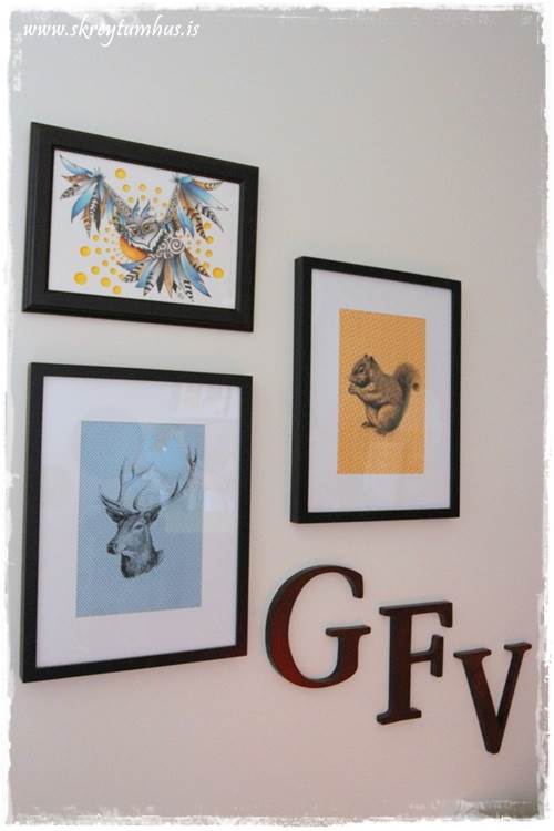 Um er að ræða þessar dásemdar teikningar sem að hún systurdóttir mín gerði fyrir krakkana og ég er búin að vera svo spennt að koma upp á vegg.  Hún Ella frænka mín er, eins og þið sjáið, alger snillingur í að teikna!