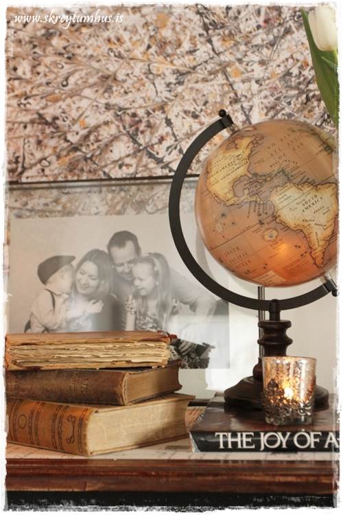 …takið líka eftir nýja script-löberinum mínum.  Özzzzzz, þetta er bara gjafapappírinn sem ég fékk í Púkó og Smart og notaði líka í stóla-DIY-ið (sjá hér)