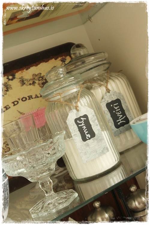 ….og að það fást svona lítil zink-skilti, alveg tóm, í Garðheimum og ég límdi á þá litla krítarlímmiða. Mikið hægt að leika sér með þessi…