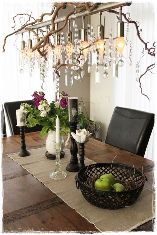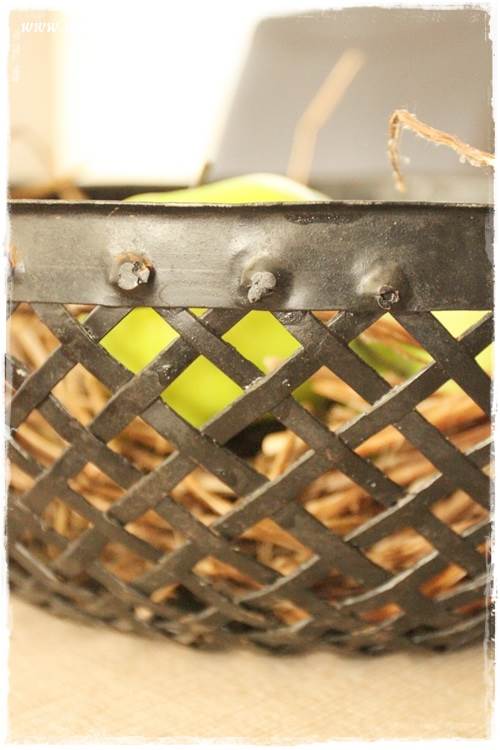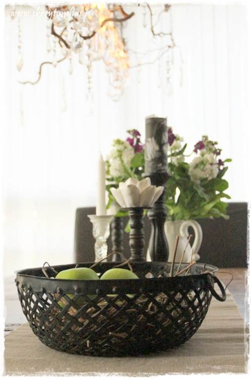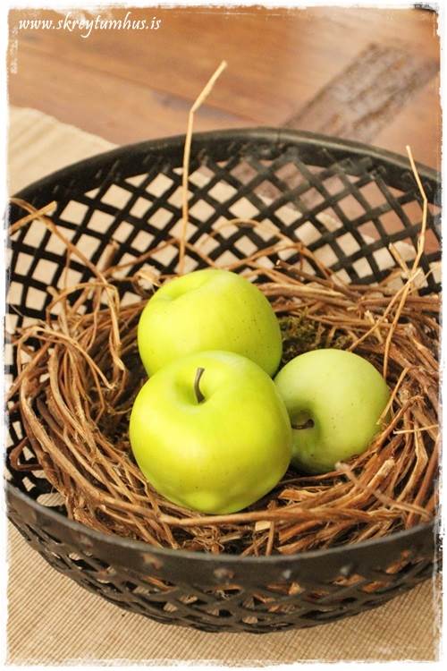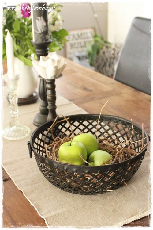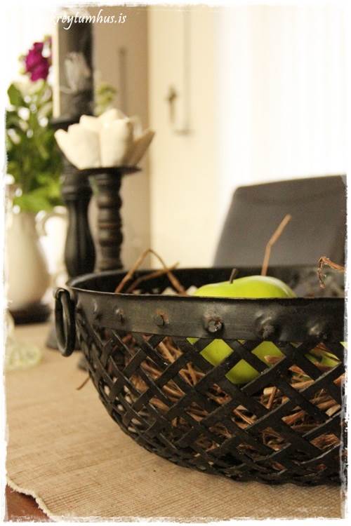 …ég varð svo skotin að hún varð innblástur að dekkri borðskreytingu á borðstofuborðinu. Það sem meira er. mér finnst þessi karfa/skal vera alveg gasalega Pottery Barn-ish 🙂