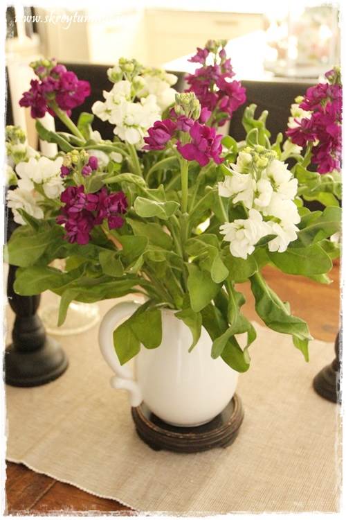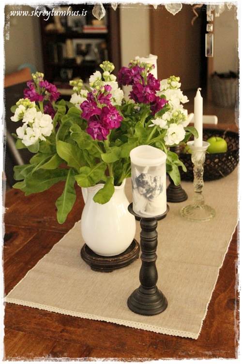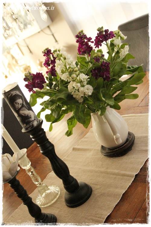 …ég setti líka dökku stjakana mína á borðið, og í könnuna mína fór vöndur af Ilmskúf (Levkoj) – sem er dásamlega ilmandi og sumarlegt blóm…