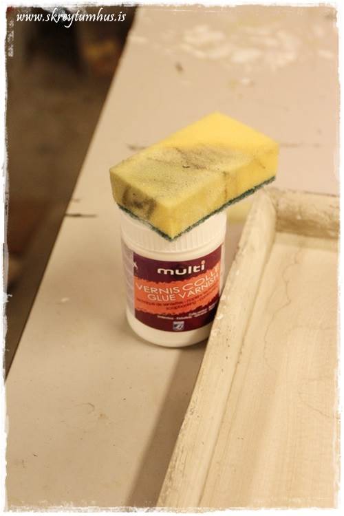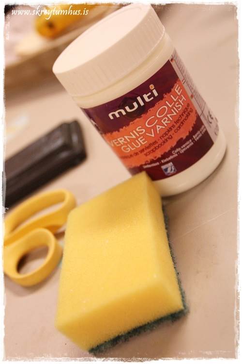 …svo er bara að nota svona lím, líka hægt að nota ModPodge. Ég nota líka yfirleitt þessa svampa í svona verk. Klippi þá niður og dreifi úr líminu með þeim – mikið hraðvirkara en pensill og ég er óþolinmóðir en amma þið vitið hvers…