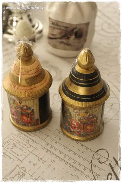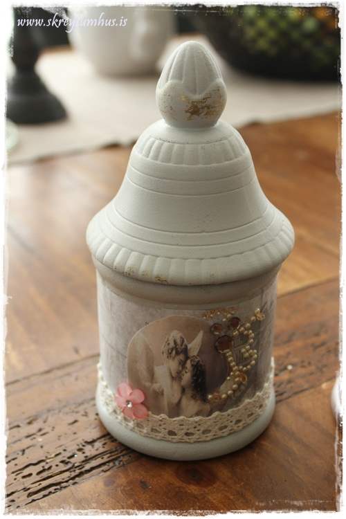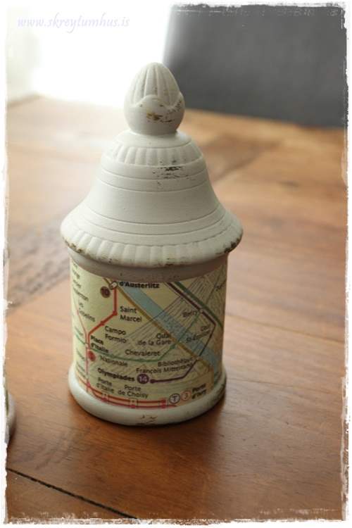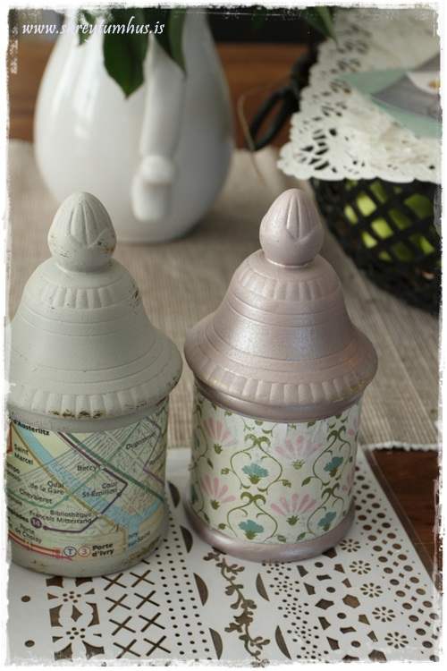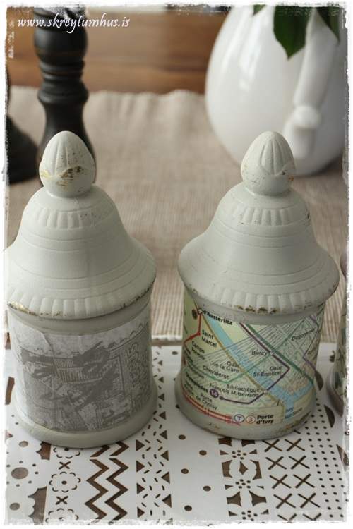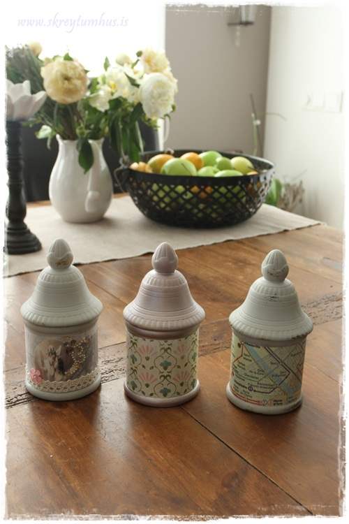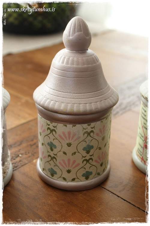 …og síðan var að mestu leiti notast við úrklippur og afganga. Fyrsta krukkan er með afgang af gjafapappír sem ég setti í bakið á skáp (sjá hér) og mynd sem ég prentaði út, önnur er með diskamottunum úr Söstrene, snilld!!