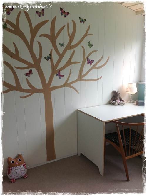 tréð á veggnum málaði ég fríhendis og setti fiðrildalímmiða úr söstrene grene í kring…