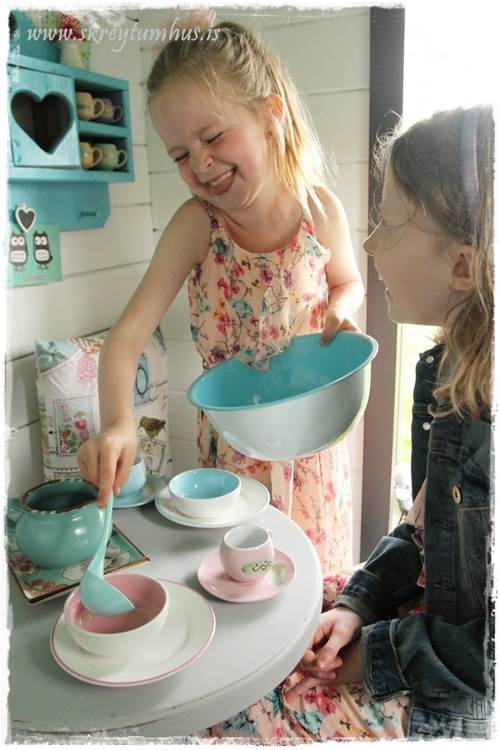 Hins vegar tók ég þann efri og spreyjaði hann í réttum lit.  Undir kössunum eru hinsvegar Bekvam-kryddhillurnar frá Ikea, standandi á hvolfi (þær eru tvær).  Hins vegar fékk ég könnuna og skálarnar núna um daginn hjá systrunum Grænu og góðu.  Kjörið að vera með könnu svo að hægt sé að fara með kalt vatn út í kofa, og svo er blá og bleik skál á fæti.  Fyrir íspartý í kofanum…