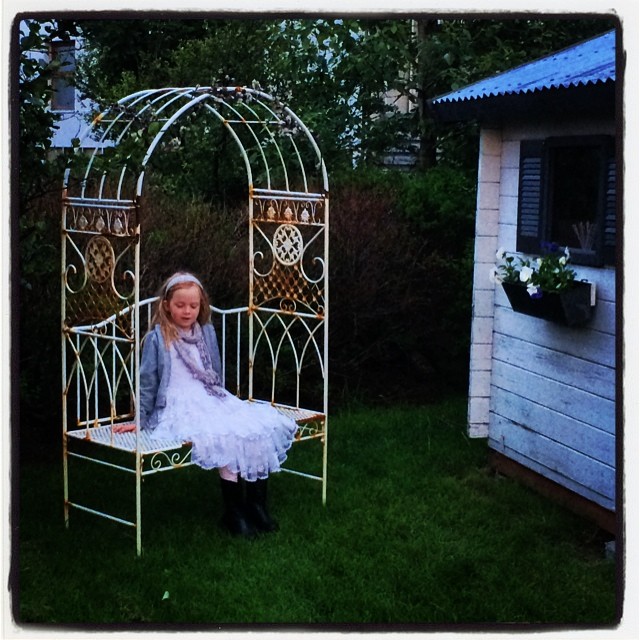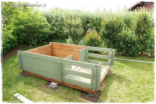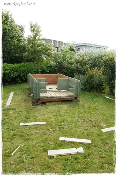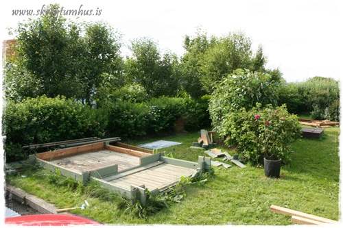 Vá hvað kofinn hefur breytt um svip! Og ég myndi setja nýja fíniríið (bekkinn) helst nálægt kofanum, þar sem sólin skín, og krúttlegt borð fyrir framan hann, þannig að krúttin þín geti líka haft kaffiboð úti þegar vel viðrar 🙂