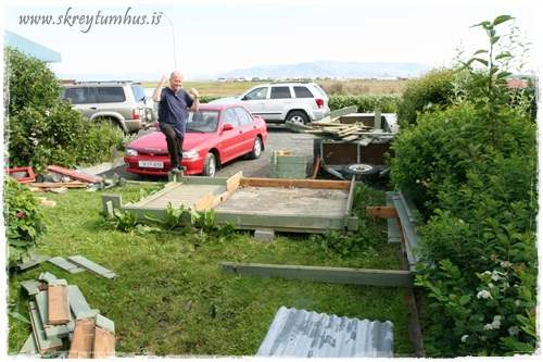 …þannig að húsbandið tók sig til og gróf holur og steypti niður fyrir kofanu á nýjum stað.