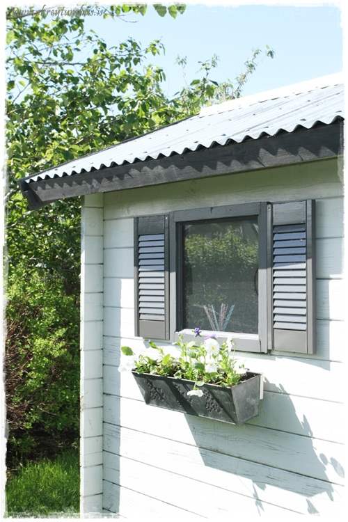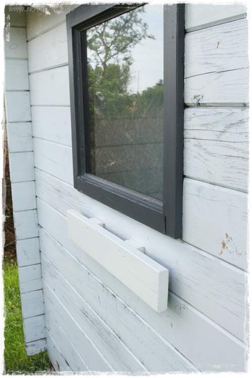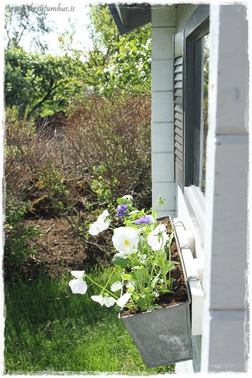 En núna vörum við komin af stað, og ég fann æðislegt gluggabox í Rúmfó sem ég vildi endilega nota og þá þarf að hafa eitthvað að hengja það á. Enn og aftur kom Kafteinn Ofurbrók Húsband til bjargar og sagaði til spýtu og festi á húsið fyrir mig…