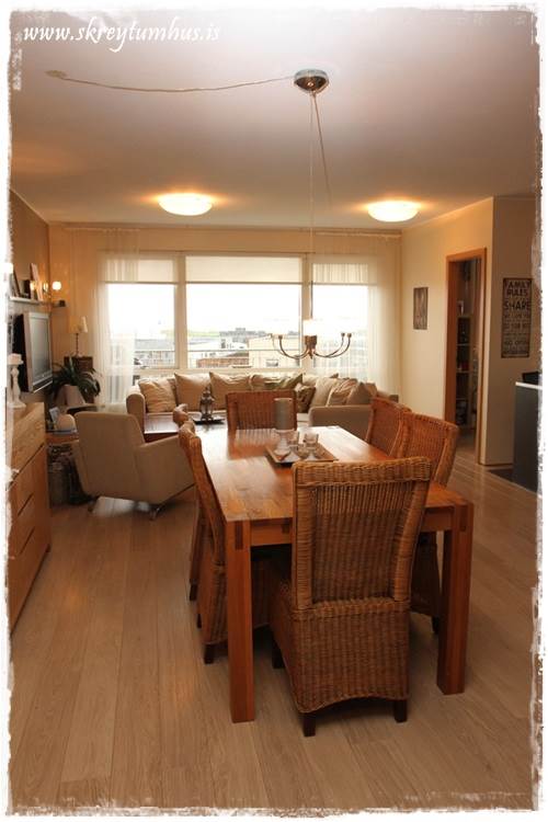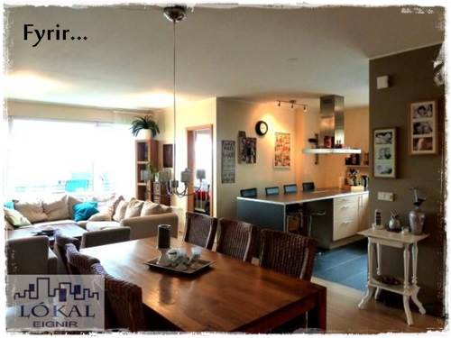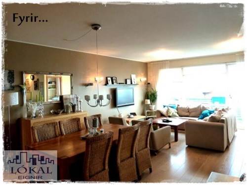 Fallega íbúðin þeirra var sett á sölu, en ég verð að viðurkenna að mér fannst myndirnar ekki skila því fullkomlega hversu falleg, rúmgóð og björt íbúðin er.  Síðan hringdu þau hjónin í okkur og báðu mig að kíkka í heimsókn og gera svona “míní-extreme-meikóver” eða diet-fyrir og eftir, og smella svo af myndum.