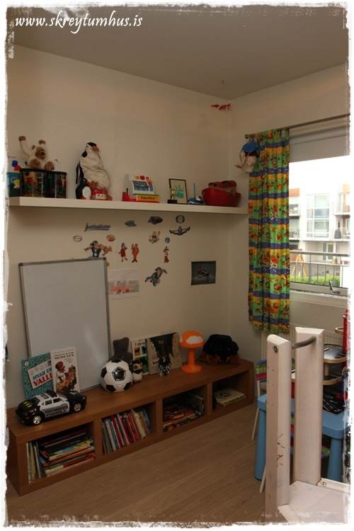 …og færðum hillu sem stóð við svalahurðina og setti á gólfið þarna, og við það myndaðist gott leikborð fyrir litla eigandann…