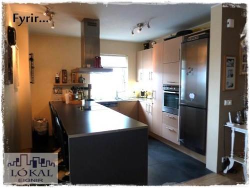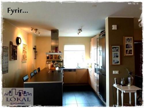 …veggurinn sem sést þarna við eyjuna er léttur veggur sem var settur upp til þess að útbúa fjórða barnaherbergið.  Einfalt að taka hann niður og útbúa þannig stærri stofu og borðstofu…