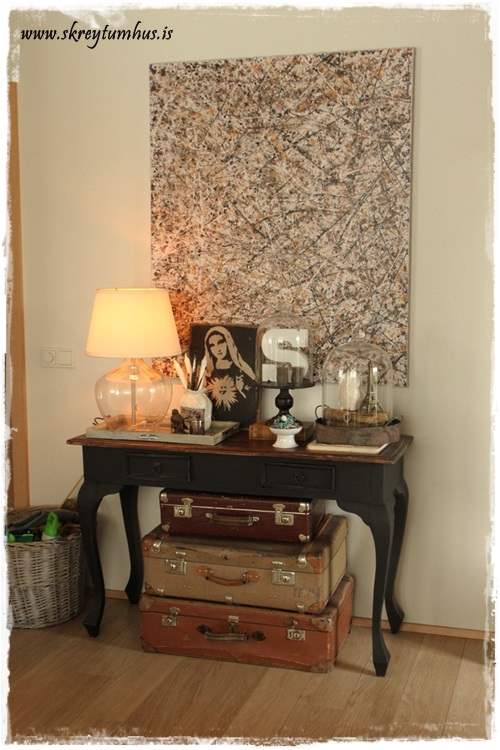 …gömlu töskurnar þykja mér afskaplega fallegar, en þær eru líka nytsamlegar og geyma alls konar föndur og blöð og bækur, jafnvel gætu leynst 2-3 púðar þarna í…