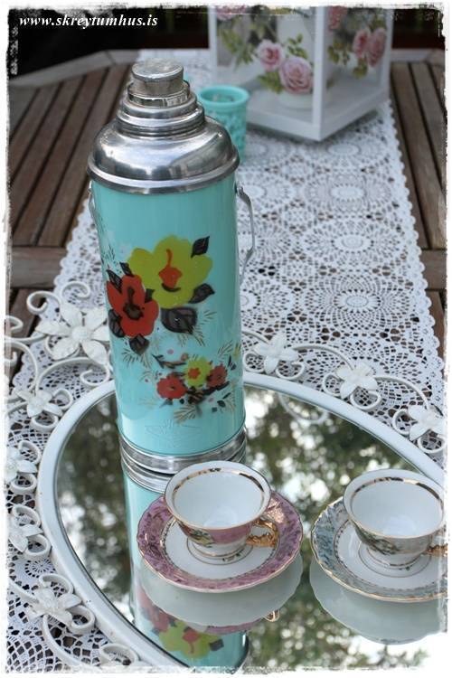 …setti líka litlu fallegu bollana út, sem ég keypti á loppumarkaði úti í Köben, og auðvitað gamla hitabrúsann líka…
