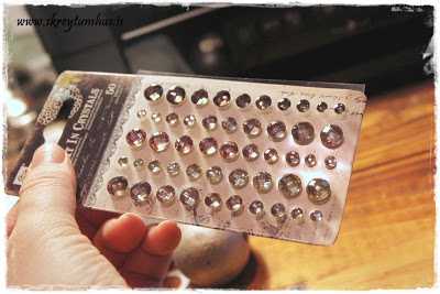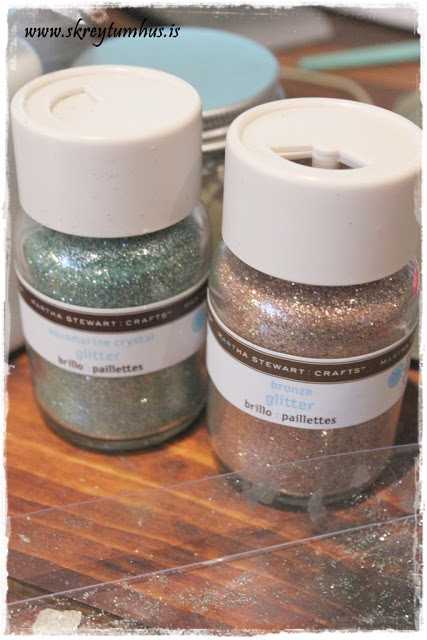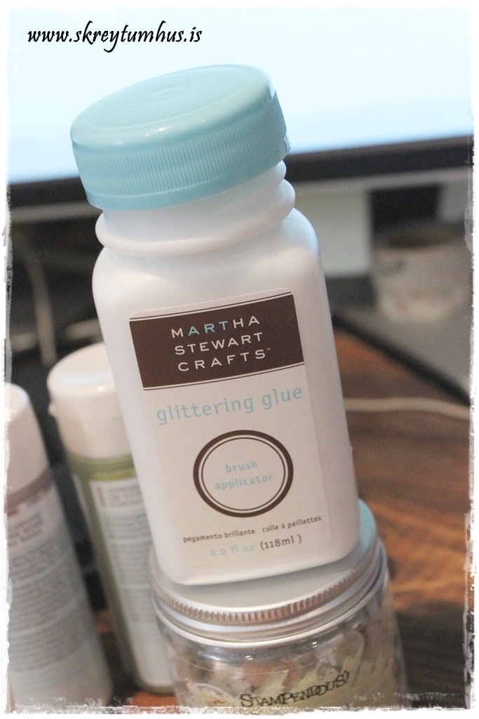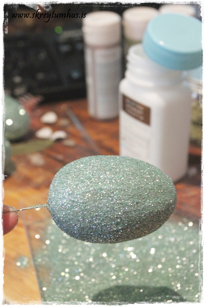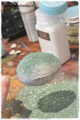 …sem sé, setja límið á, hella glimmer yfir (og passa að hafa blað undir þannig að hægt sé að hella afgangsglimmerinu aftur í dolluna)…