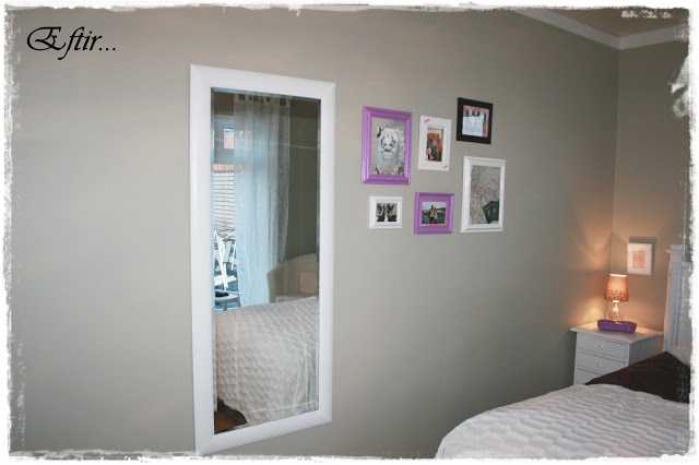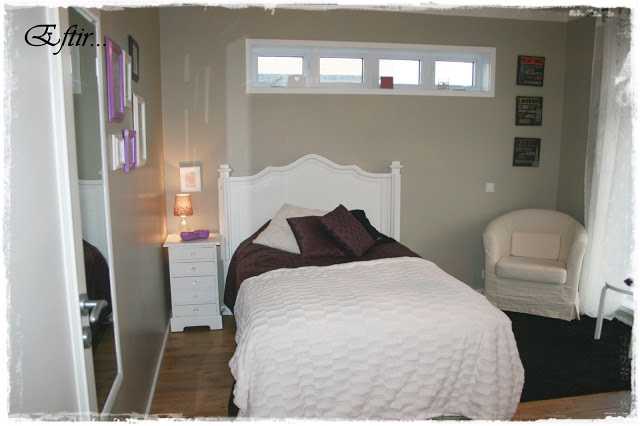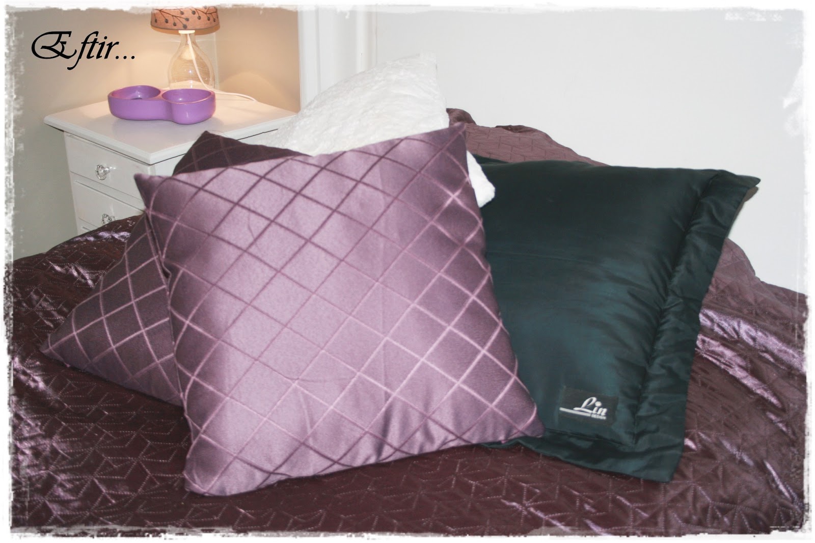 Mig langar að byrja á því að þakka þér fyrir yndislegt blog og æðislega hjálp, þó að þér hafi kanski ekki fyndist þú gera mikið, en bara að koma mér af stað með þínum hugmyndum hjálpaði mér að gera þetta herbergi að veruleika og úr varð þessi líka fína fermingargjöf :o) þú hefur “fyrir” myndirnar sem ég var búin að senda þér svo hér koma eftir myndirnar. Við ákváðum að halda litnum sem var fyrir á veggjunum í herberginu, og kanski gott að nefna það að fermingarbarnið er með hjónaherbergið :o)  Höfðagaflinn keypti ég á bland.is á 4000kr, og lakkaði hvítan. Rúmið,sæng,koddi, teppinn og hvítu og fjólubláu púðarnir er gjöf frá ömmunni og afanum…rúmið keypt líka á bland.isÞað er svartur púði á rúminu sem er frá Lín design, hann keypti ég í Góða hirðinum á 100kr.
