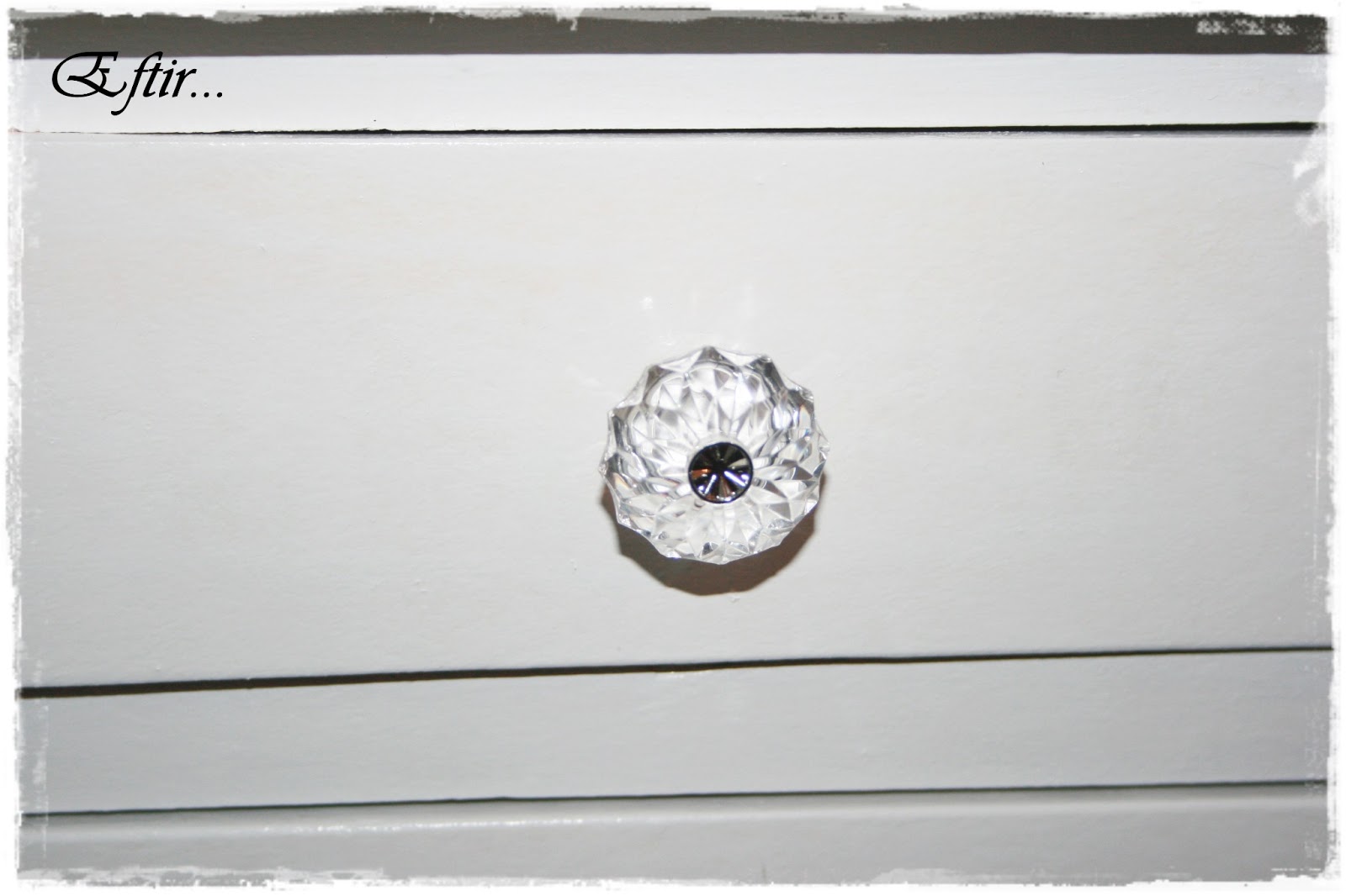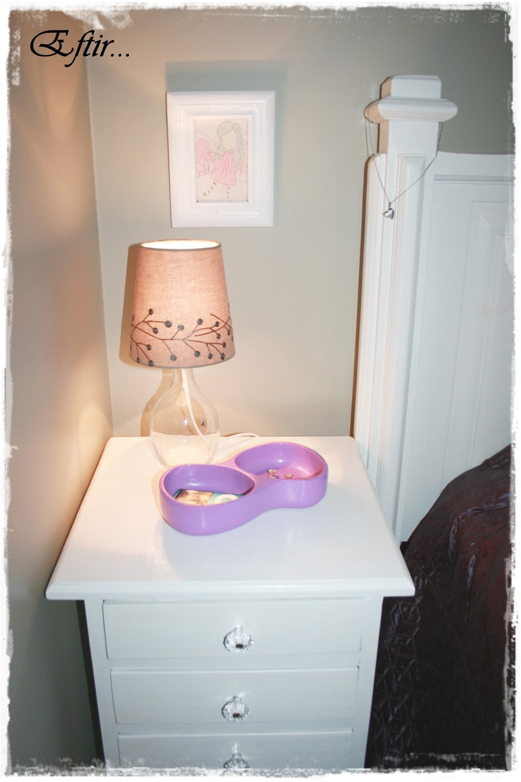 Náttborðið er af bland, var pússað og málað og höldurnar frá Bauhaus, Takk Soffía fyrir að benda mér á þær. Lampinn keyptur í Ikea, skálinn frá GH og ramminn líka, en svo brotnaði glerið í honum í látunum hérna en það kom ekki að sök og myndin er teikning eftir heimasætuna.