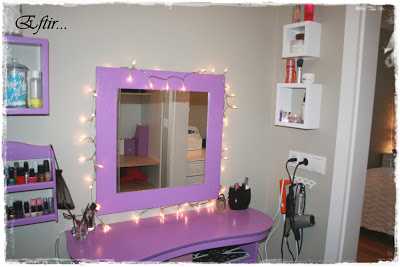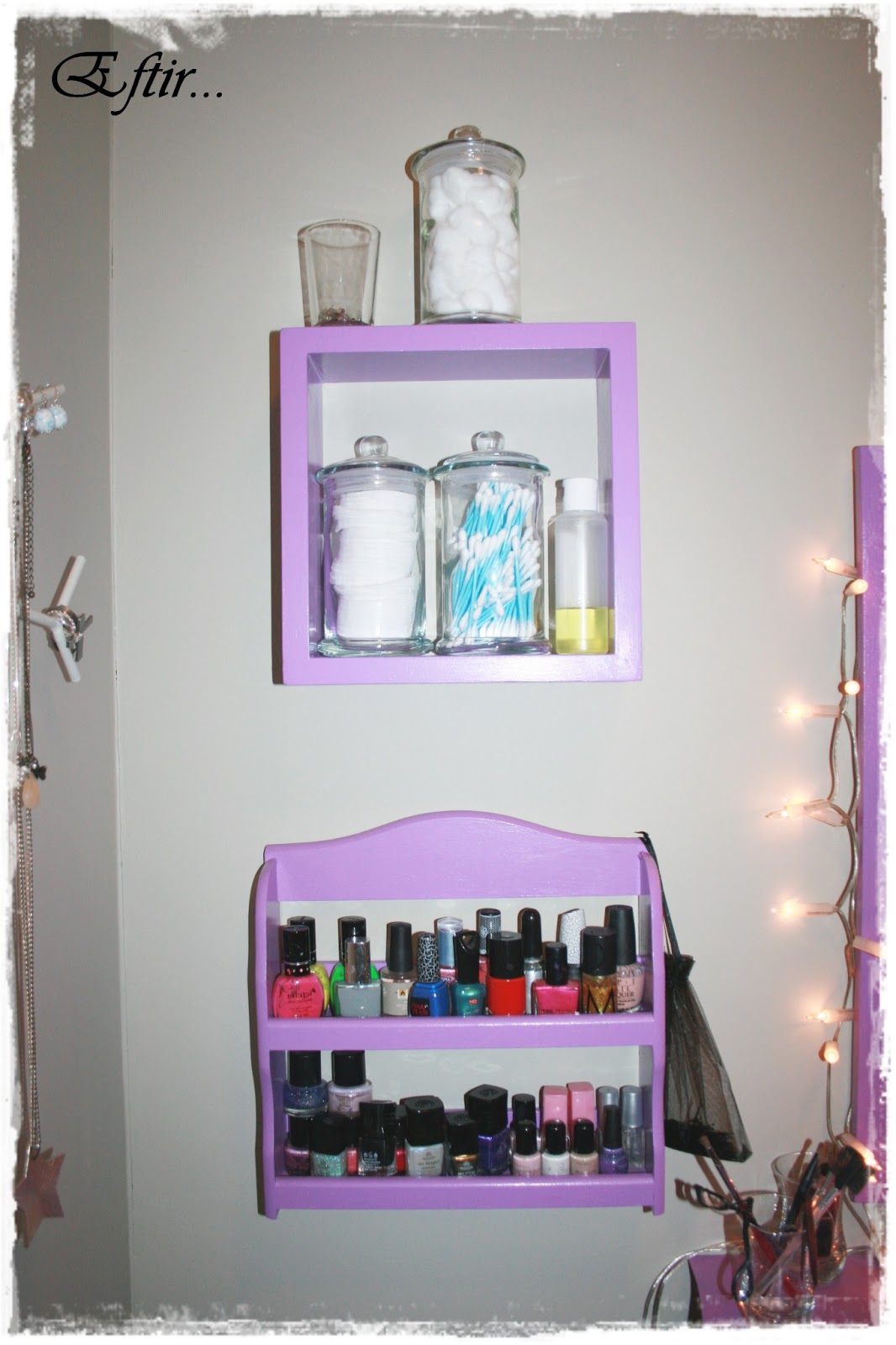 Spegillinn, borðið og allar hillurnar er allt keypt notað, get eiginlega talið það á annarri hendi hvað var keypt nýtt inní herbergið. Á eitthvað eftir að laga þetta með seríuna í kringum spegilinn…..