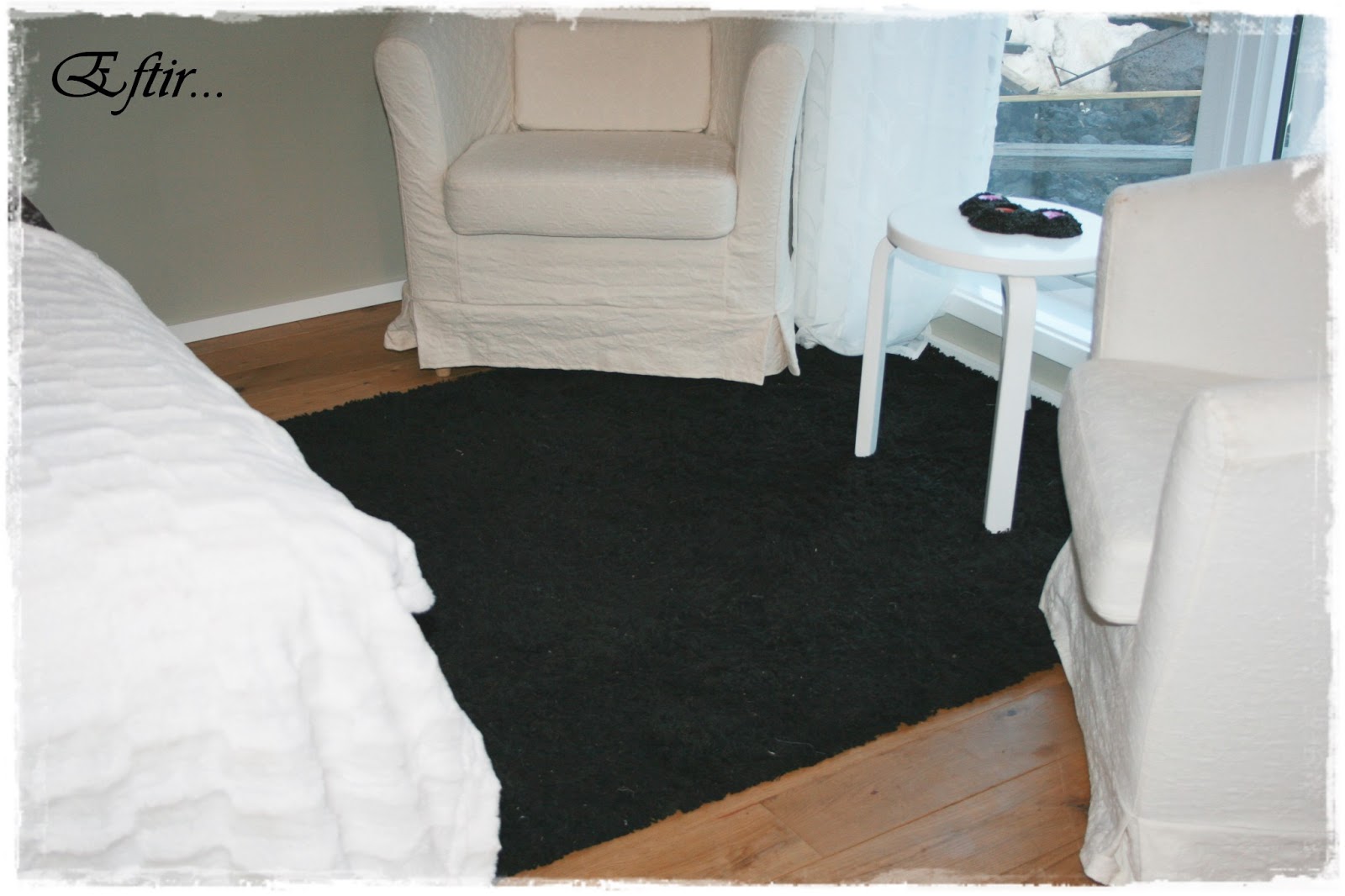 …þegar að myndirnar eru svona hlið við hlið, þá sést það vel hvað það breytir miklu að hækka gardínustöngina.  Það er nefnilega algengur miskilningur að festa stöngina bara rétt fyrir ofan glugggann.  Alltaf að færa stöngina eins nálægt lofti og hægt er 🙂  Eins held ég að það hafi verið hárétt ákvörðun að setja ekki sófasett heldur hægindastóla – húrra!