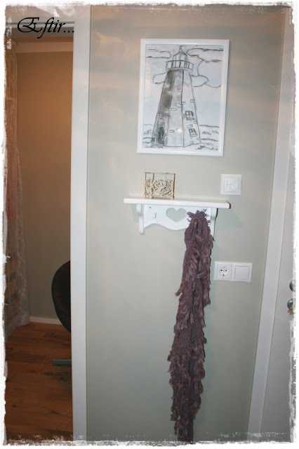 Ég algjörlega fell fyrir loftljósinu á (enn eina ferðina bland) og fékk það fyrir 2000kr.  Litlu hilluna undir myndinni átti ég.Ég vildi ekki setja neitt fyrir hurðina inní fataherbergið svo ég keypti þessa blúndugardínu á 400kr og setti fyrir skápinn sjálfan.