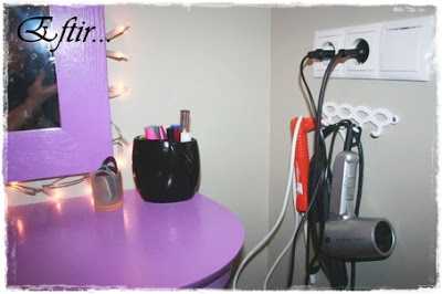 Svo gerðum við smá snyrtiaðstöðu handa skvísunni…… stóllinn er rauður en það passaði ekki inn svo ég tók gamla svarta blúndu gardínu sem ég átti og bólstraði bara stólinn, mín frumraun….