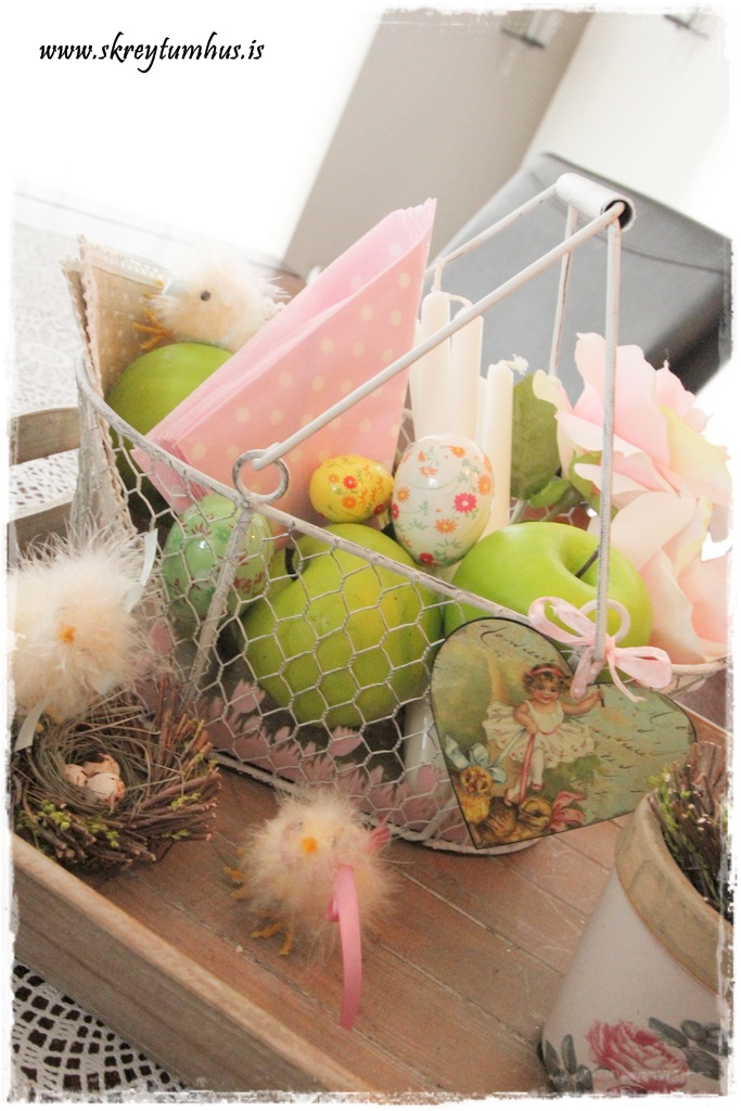 …hann gerir nefnilega ansi mikið!  Síðan setti ég mjúka diskamottu ofan í körfuna mína, gervirósir, epli, servéttur, kerti og nokkur skreytiegg…