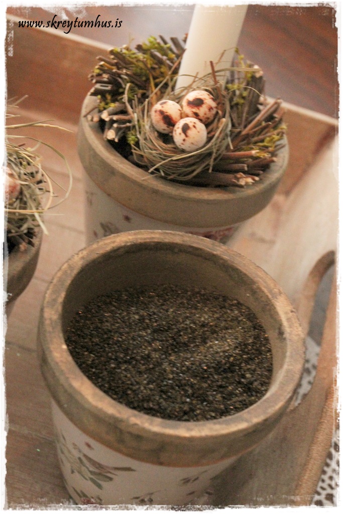 Sniðugt að nota pottana sem eru btw gordjösss……og hreiðrin eru æðisleg. Verð að bruna í blómaval og bæta í það litla páskaskraut sem ég á. Þessi páskablogg eru hreint yndi og fær mann til að langa að skreyta…og skreyta, sem mig hefur alltaf langað til að gera en ekki gert – nema kanski með gömlu páskaeggjarungunum :/ hehe…