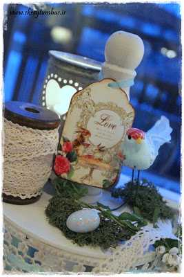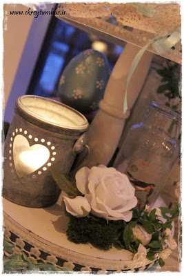 …samansafnið byggist á tveimur kertastjökum, eggjunum sem að ég málaði um daginn, kanínukrúttunum, smá mosa, silkiblómum og blúnduborðakefli sem að ég á. Hinum megin er síðan hár kertastjaki, blár blómastjaki og vírkarfa sem að ég setti á diskinn með háa fætinum…