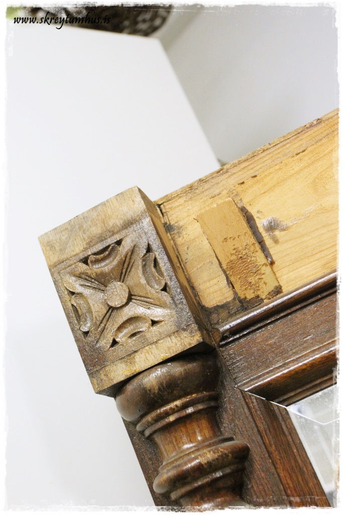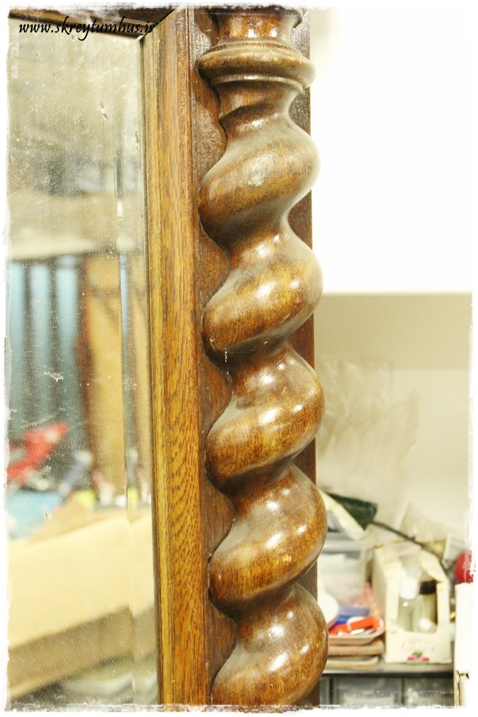 Fyrsta á döfinni. Í einn ferð minni í þann Góða þá keypti ég gamlan yndislegan spegil. Þetta hefur greinilega verið á skenk einhvern tímann í denn og það sést vel á honum hversu þreyttur hann var orðinn (og já, það er sko ekkert drasl í þessum bílskúr – eða þannig).