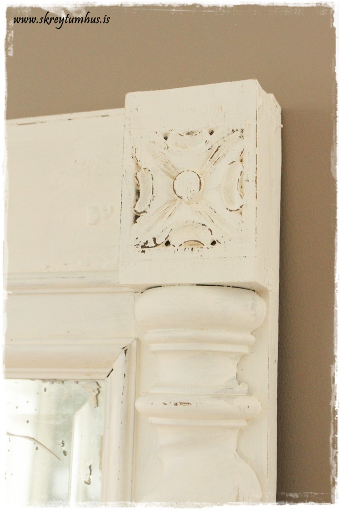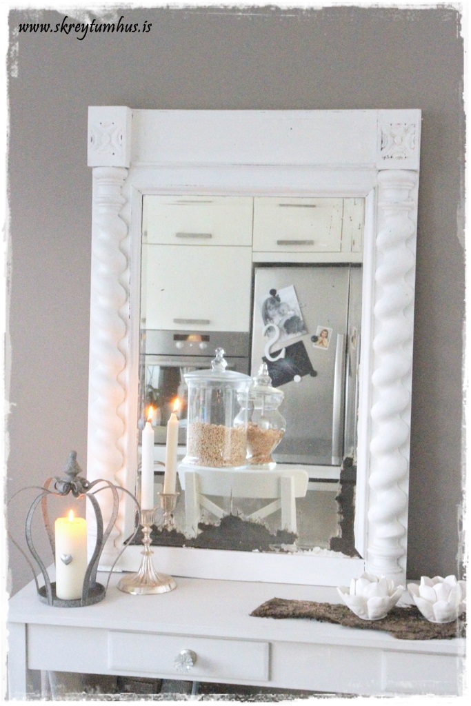 Vá spegillinn sjálfur svona slitinn finst mér algjört æði og alveg snilld að setja svona gamla mynd bakvið. Svo held ég að það mætti alveg skoða það að hafa hann bara grunnaðann, bara klára pússeríið. Ég sjáft er voða hrifin af möttu hvítu áferðinni sem fæst með grunninum. Þessi er allavega sko algjört æði.