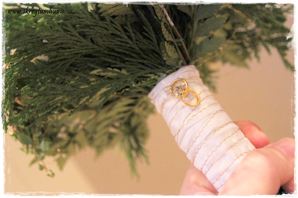 …þegar ég gekk frá stilkunum á vendinum, þá vafði ég silkiborða utanmeð og gullþræði sem var festur með demantapinna, ásamt því að setja tvo litla gullhringa með….