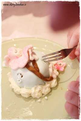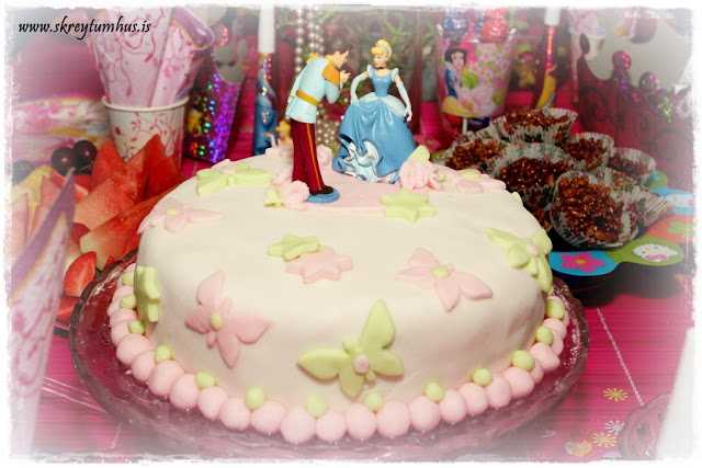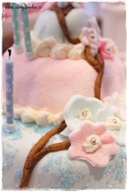 …þegar að þú ert síðan búin að fletja fondantinn út og setja yfir kökuna, þá er um að gera að nota skrautið og t.d. smjörkremið, eins og ég nota hér, til þess að “fela” syndir sem verða 🙂