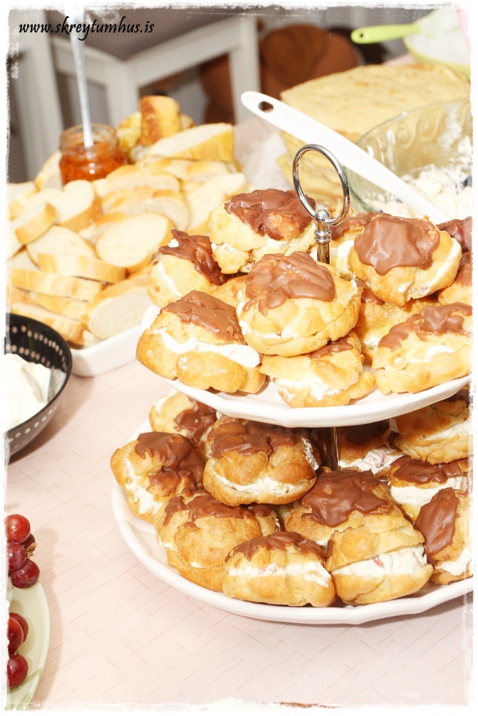 Einhver spurði um kremið sem að hélst svona fínt á súkkulaðikökunni, en það kom einmitt frá henni Betty frænku líka – hún er agalega hjálpsöm. Þannig að munið það, að kaupa tvær krukkur af kremi í það minnsta fyrir hverja veislu, eina hvíta sem að hægt er að setja hvaða lit sem er á, og svo annað súkkó.
