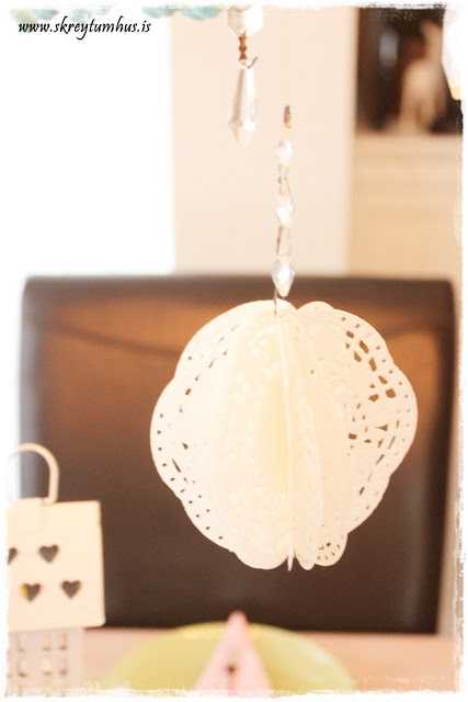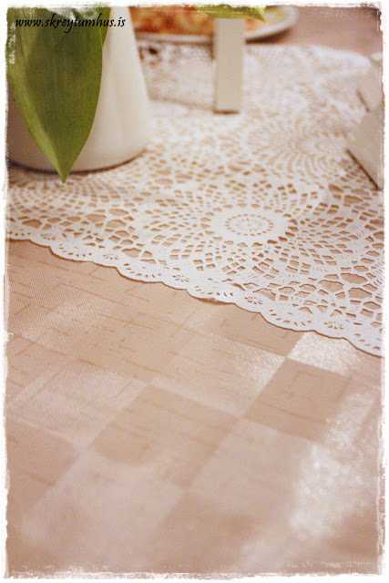 Þá var innblásturinn kominn, leikandi ljósar blúndukúlur, og hvað gengur betur með blúndu en bleikt?  Því tók ég bara ljósbleikan dúk sem ég keypti fyrir löngu síðan og ákvað að nota hann með.  En þar sem að mér finnst alltaf skemmtilegt að brjóta upp miðjuna, þá setti ég blúndurenning þar.