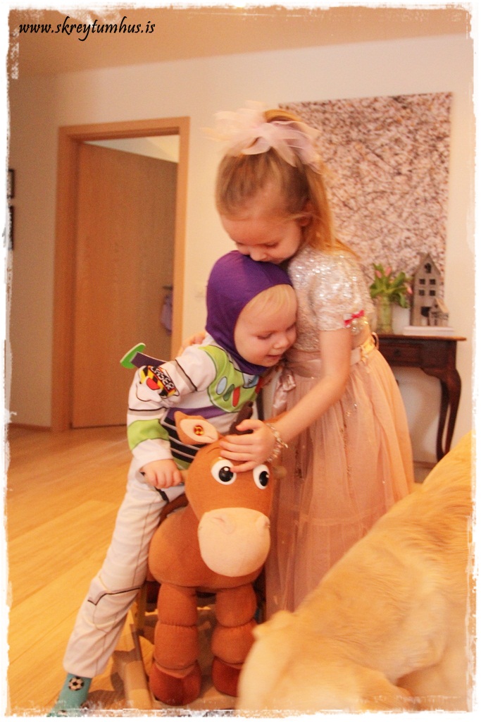 …er svo stolt af þessari yndislegu stelpu minni, hún hafði svo miklar áhyggjur fyrir þennan dag að bróðir hennar myndi ekki fá neinn pakka. Hún fékk því að gefa honum grímubúninginn, sem hann fór ekki úr allan daginn 🙂