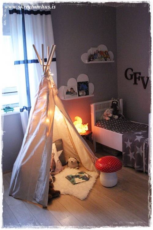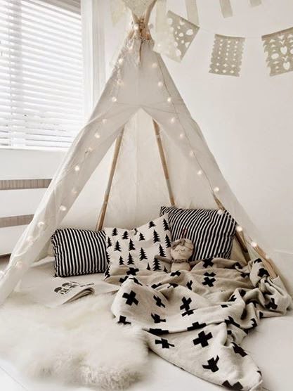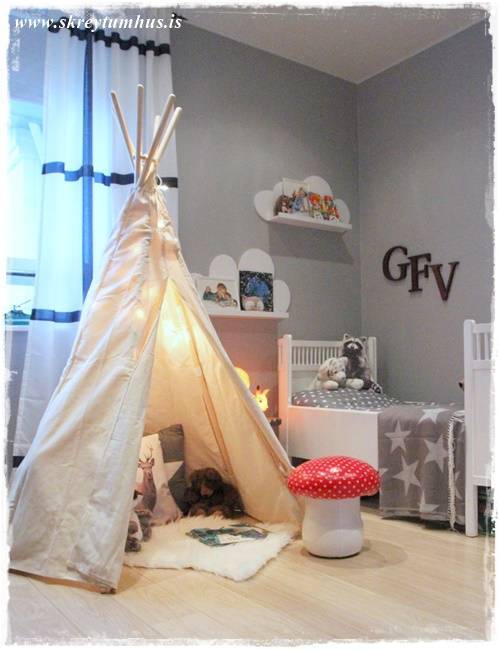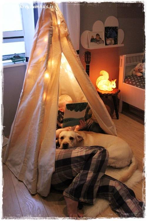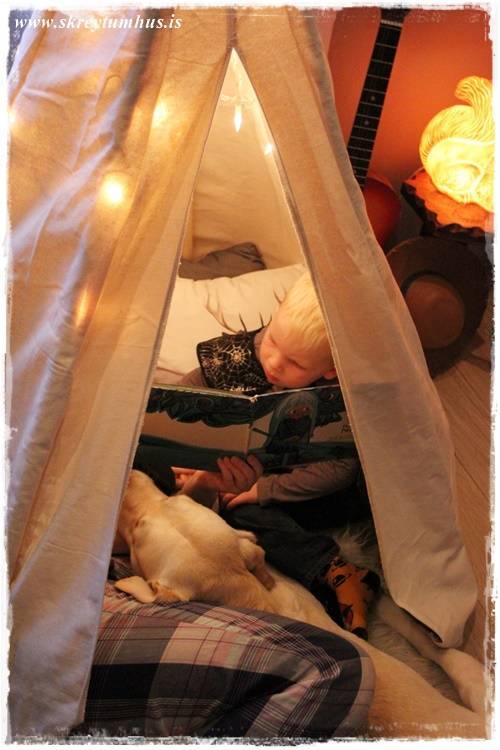 Ég væri til í að hafa svona tjald í sameiginlegu holi fjölskyldunnar fyrir mínar stelpur. Sú eldri hefur oft fengið okkur foreldrana til að búa til tjöld úr stólum, húsgögnum og teppum sem fengið hafa að standa í nokkra daga í senn – þar til mamman alveg ærist á öllu draslinu. Miklu betra að eiga svona fallegt tjald sem maður getur þá skreytt jafnvel eftir árstíðum …..