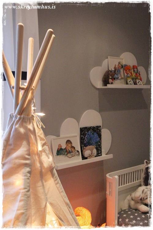 …og mér finnst það koma svo fallega út inni í herberginu, með skýin svona í baksýn…