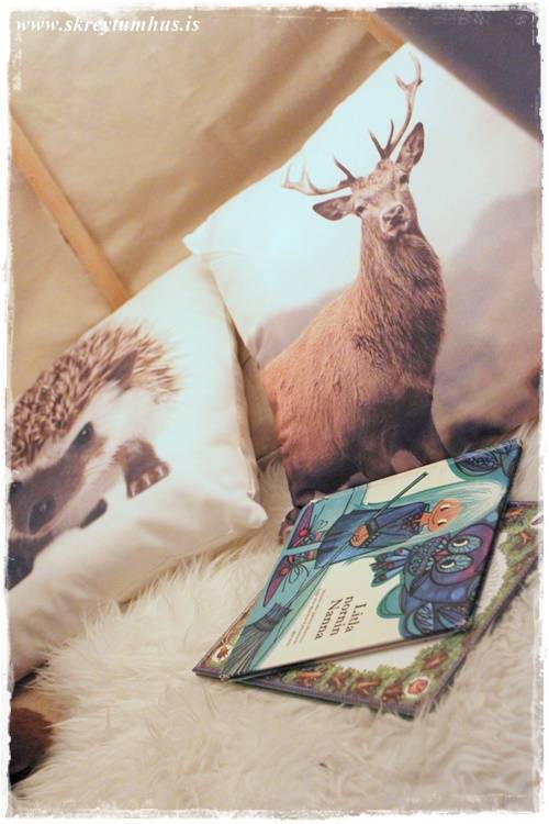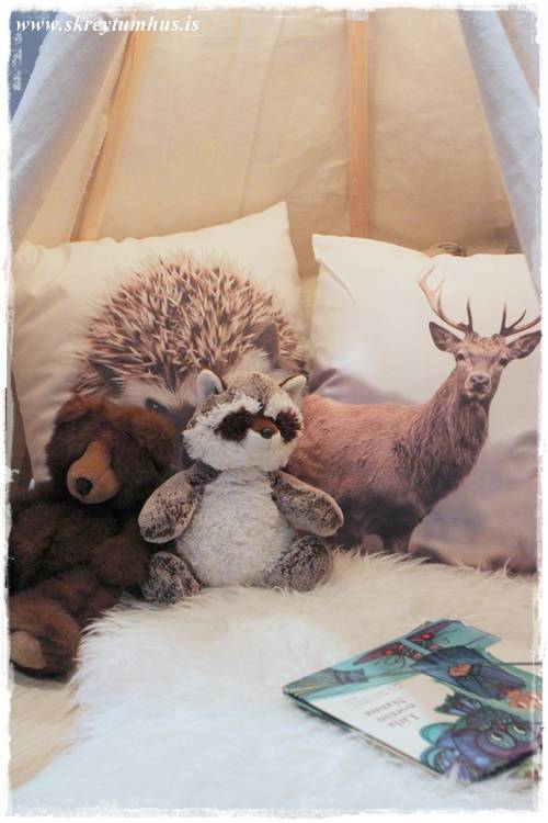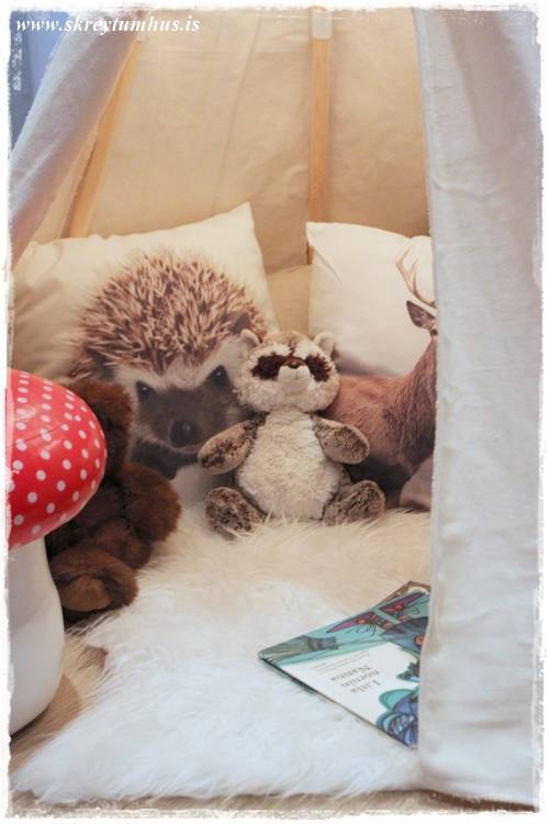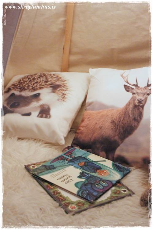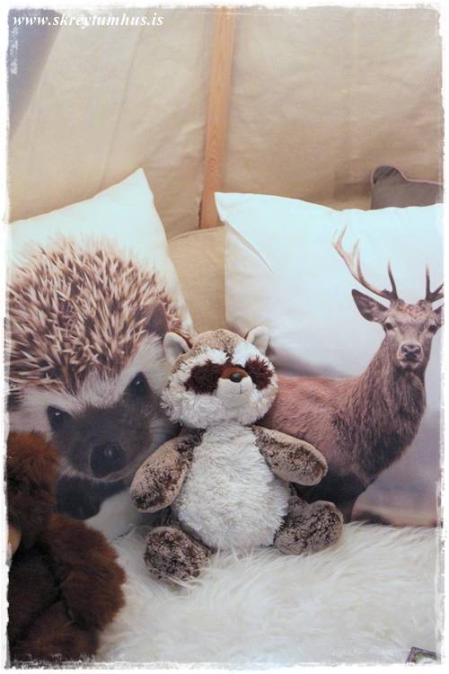 …svo leggst maður inn á koddana (þessi með broddgeltinum er gamall frá Söstrene, en sá með hreindýrinu er nýr úr Rúmfó)…