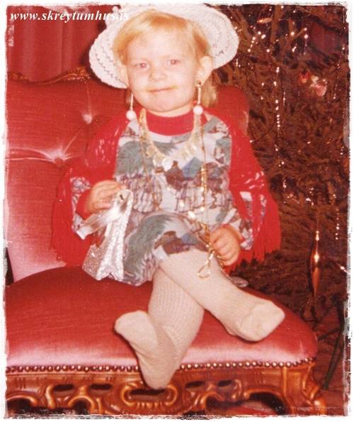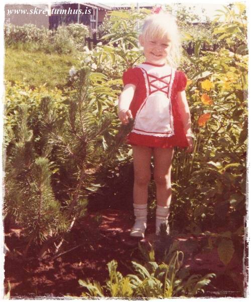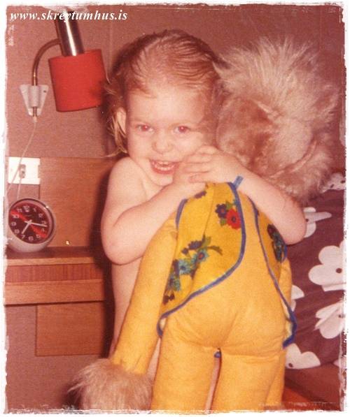 Þetta var í miklu uppáhaldi og nánast notað allt árið um kring, því eins og sést á hversu vel við erum klædd – þá erum við ekki klædd fyrir sumarveður.  En endilega takið eftir að litla skreytiskjóðan er sko í mjallahvítri úlpu með loðkraga, auðvitað 🙂