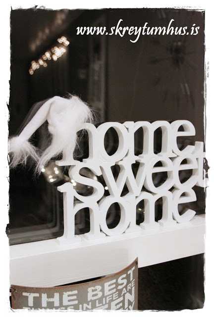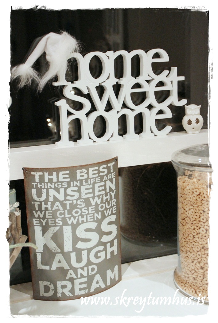 Í einum glugganum í eldhúsinu standa HomeSweetHome stafirnir ásamt fleiru…