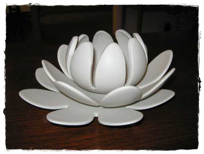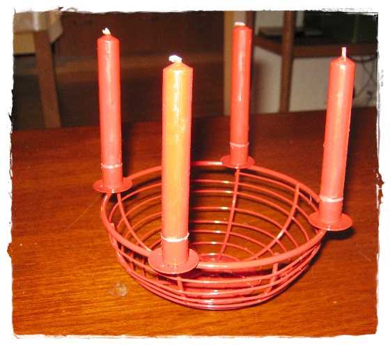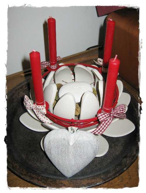 Ljósa blómið er lótusblóm sem ég keypti í the Pier, rauði stjakinn og kertinn fékk ég í Býflugunni og blóminu, könglanna lika, hjartað keypti ég í Svíþjóð og steinninn í miðjunni fékk ég lika í Svíþjóð. Ljósu slaufunar fékk ég í Sirku og köflóttu átti ég fyrir.