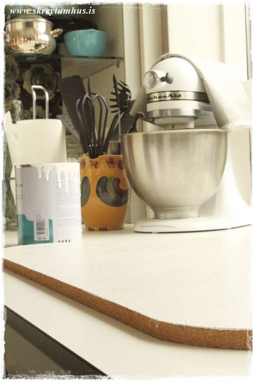 …skýið festi ég upp með svona límfestingu úr Bauhaus, en ég þarf að finna eitthvað betra því að hún þoldi ekki lengi við. Hugsanleg bara að setja tvær svoleiðis eða jafnvel bara að útbúa einfalt gat beint í gegnum korkinn…