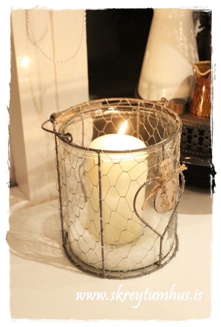 Sæta vírkertakrúsin mín hefur staðið hérna í eldhúsinu, ég var búin að setja smá snjó í botninn á henni – og síðan dassaði ég smá glimmer yfir kertið og snjóinn.  Þá verður líka svona glimmer í kertinu þegar að  það brennur og það er bara bjútifúlt…