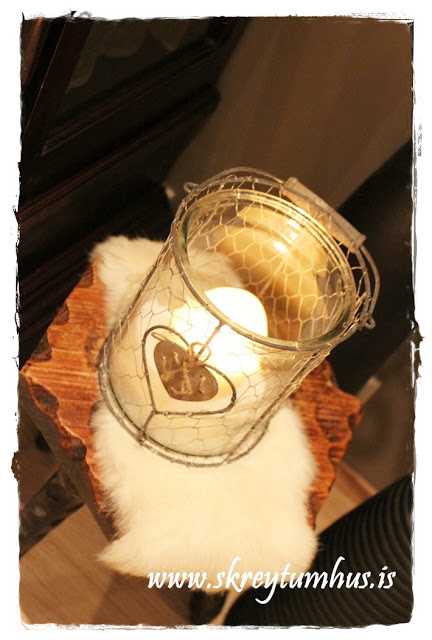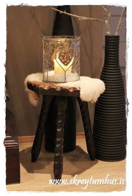 Jújú, við hliðina á stóra skápnum, á eeeeeeldgömlum kolli sem kemur heimar frá foreldrasettinu mínu elskulega.    Hvíta skinnið sem ég setti síðan undir kertakrúsina sótti ég inni í herbergi dóttur minnar.  Hún notar það nefnilega þegar hún er að leika í Barbie og Bratz, þá er þetta stundum sett ofan á rúm og svoleiðis.  Það sem meira er, að þetta skinn notaði ég í sömu leikjum fyrir 30 árum síðan.  Endurnýting og samnýting og allt það….